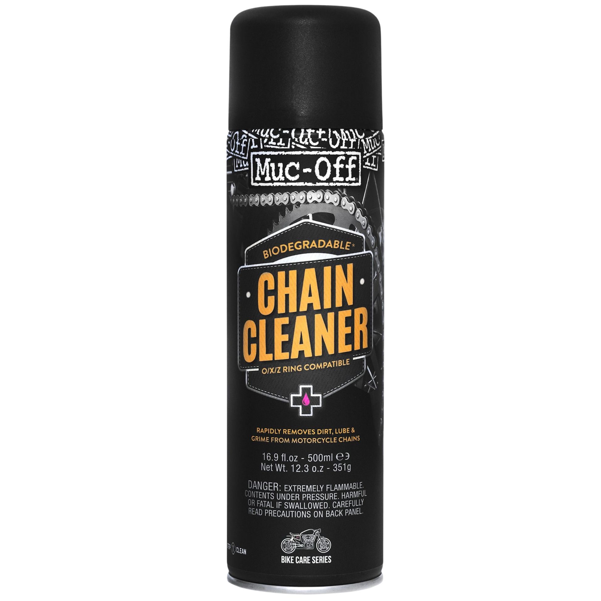 - Muc-Off Motorcycle Chain Cleaner has been specifically formulated to quickly and safely remove dirt, lube and heavy chain grime using advanced solvents. Its unique biodegradable formula breaks down oil and grease to leave the entire chain sparkling clean and contaminant free. Now with Watermelon fragrance!